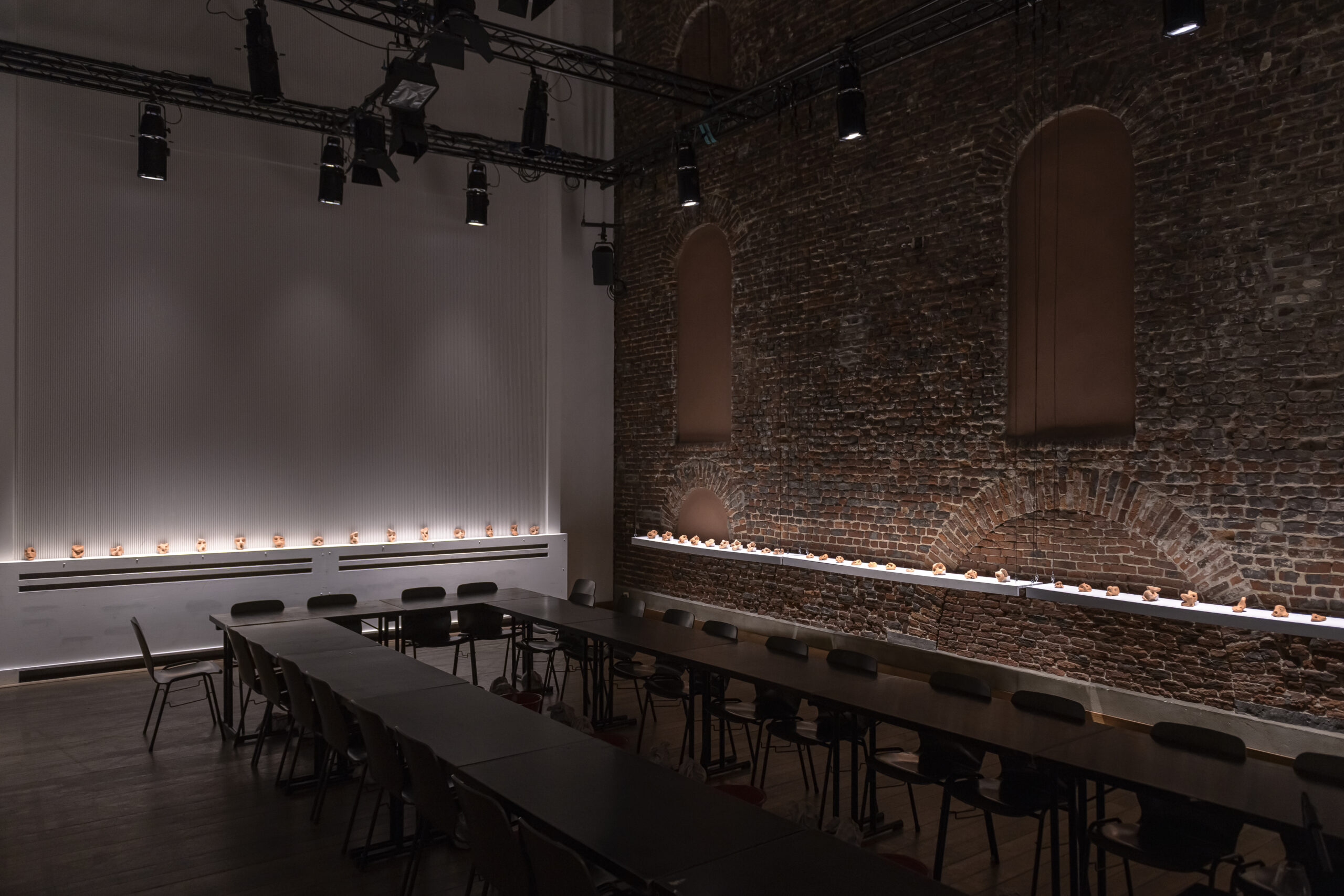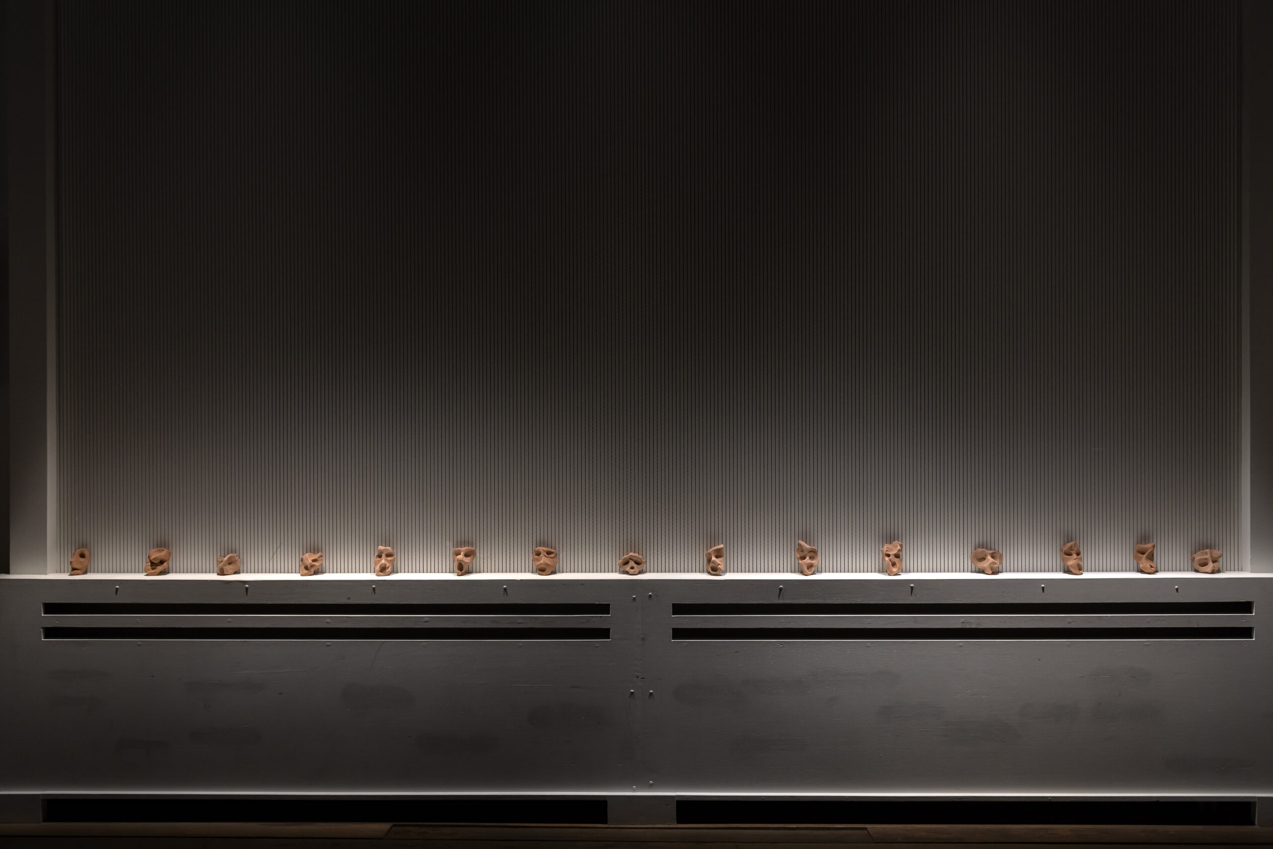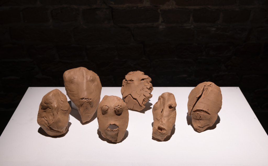 In the first part, the audience encounters a series of ceramic faces made during different residencies.